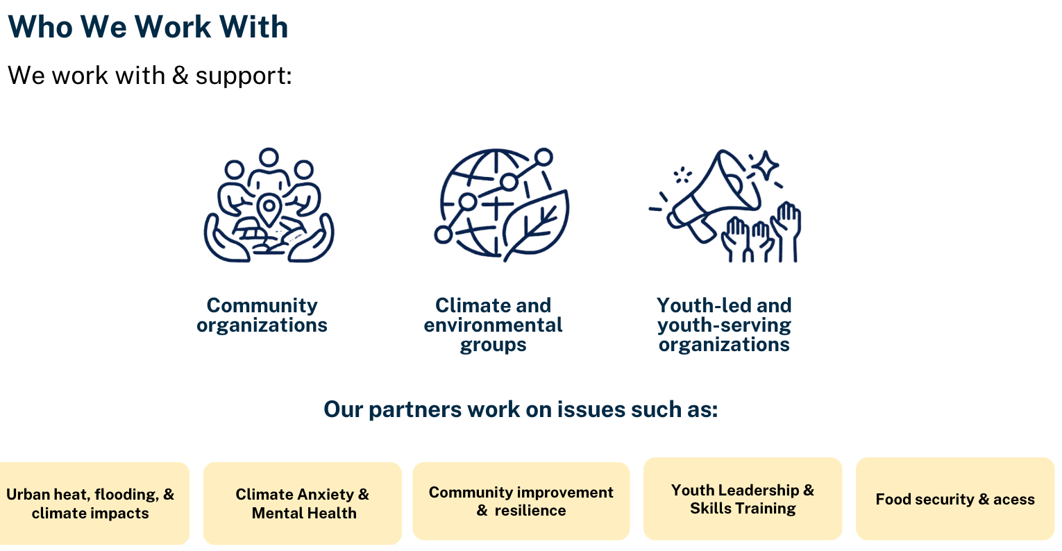 We build on existing community strengths and amplify work already underway, including organizing around urban heat, flood preparedness, food access, climate anxiety, and the countless local efforts that rarely make the news but hold communities together and keep people safe.