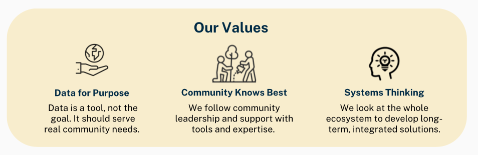We work where community knowledge, data, and climate action meet. Our job isn't to be the experts with all the answers, it's to help communities tell their stories with data, mobilize their collective actions, and create connections across the groups and sectors that are often siloed.