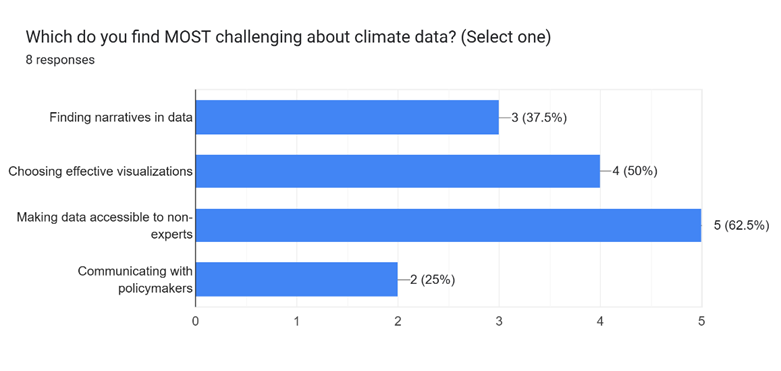 At Climate Resilient Communities (CRC), we’ve been listening closely to individuals who are eager to engage with climate data but often run into roadblocks. In our Data Storytelling for Climate Policy Advocacy workshop, we asked folks what they find most challenging about communicating climate data. As you can see in Figure 2, the most common responses were: making data accessible to non-experts (62.5%), choosing effective visualizations (50%), and uncovering compelling narratives within the data (37.5%).