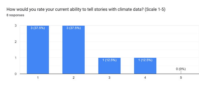 Access to climate data is so important for building resilient communities, but in my experience, many people still struggle to use it effectively. In recent workshops and community conversations, we asked participants to rate their current ability to tell stories using climate data on a scale from 1 to 5. As shown in Figure 1, the majority of the 8 respondents gave a rating of either 1 or 2.